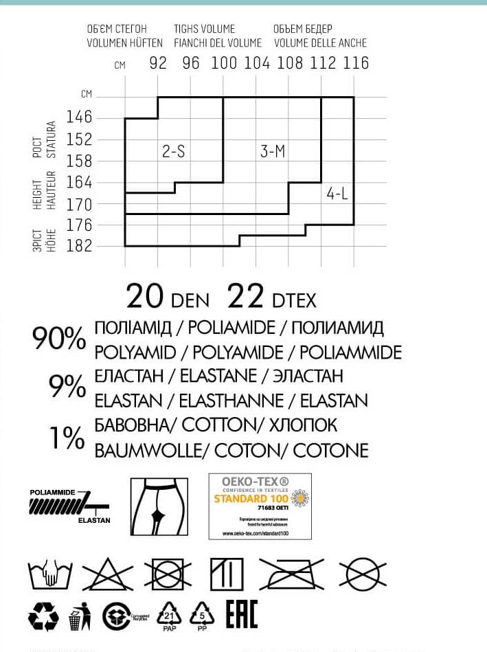 Тонкие фантазийные колготки с оплетенным эластаном, плотностью 20 ден, с широким комфортным поясом, х/б ластовицей и усиленным плоским швом. По всей ноге модели размещен тканый узор "горох". Эластан, обкрученный полиамидом, обеспечивает хорошую растяжимость модели и придает ей мягкость.