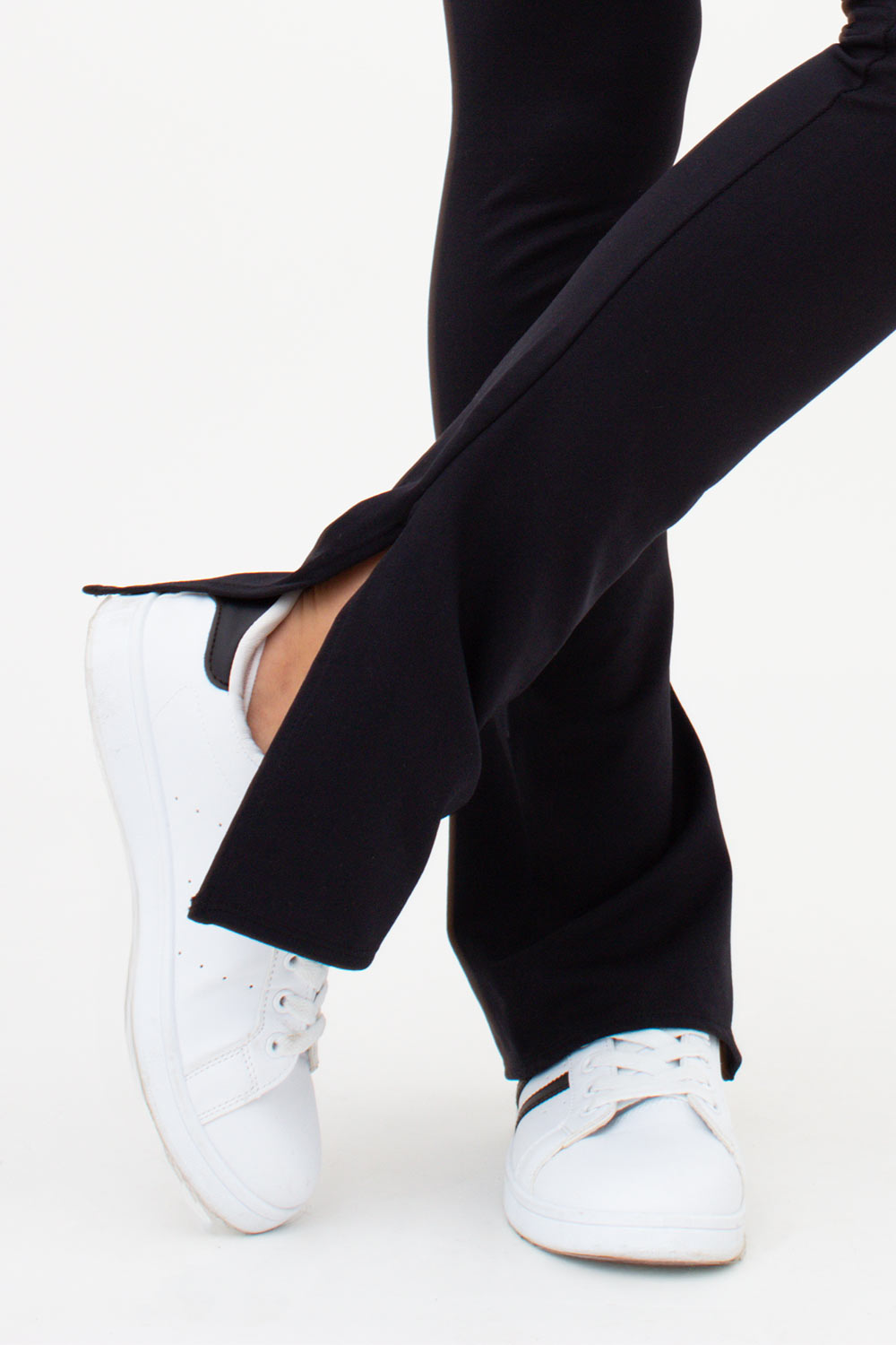 Особенностью модели являются боковые разрезы с внутренней стороны штанины, которые создают лёгкий эффект клёша и придают образу оригинальности. Легинсы гармонично сочетаются как с кроссовками для повседневного стиля, так и с каблуками — для более элегантного образа.