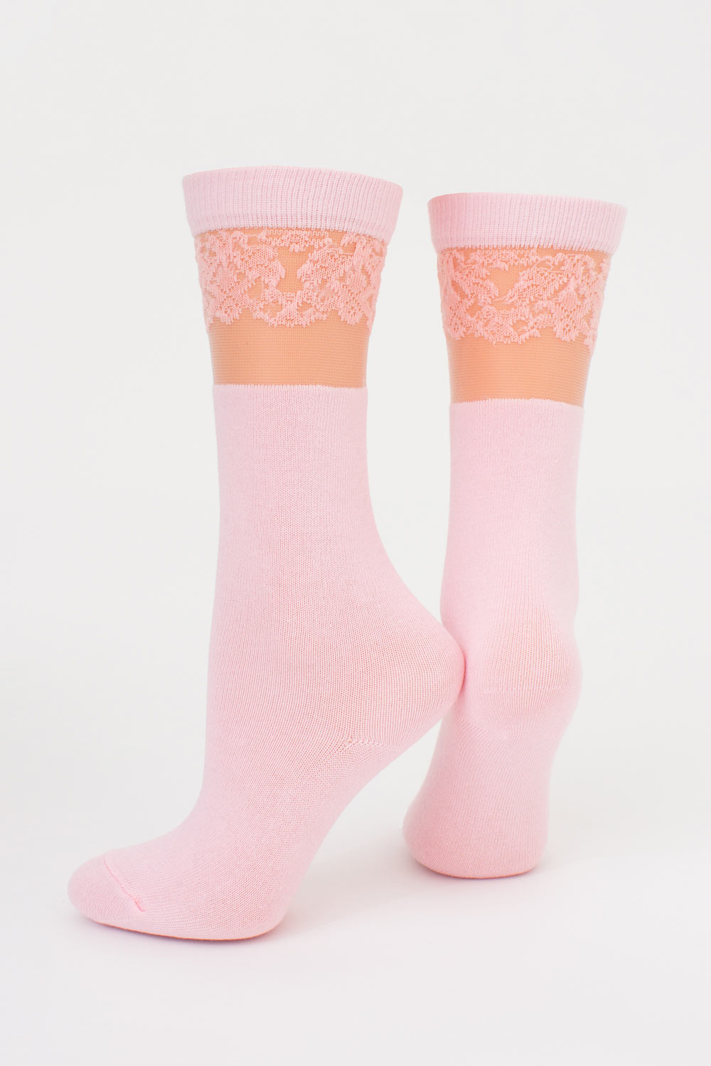 Сверху гольфы украшены прозрачной вставкой из мононити с нежным узором.