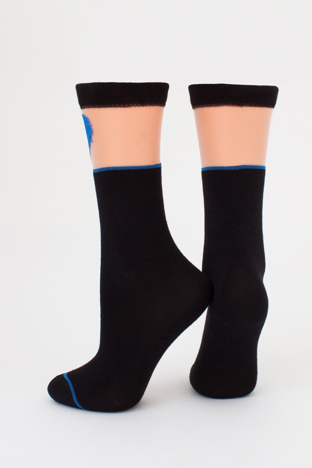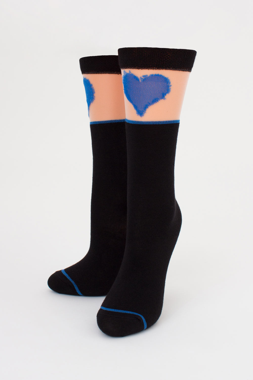 Сверху гольфы украшены прозрачной вставкой из мононити с ярким рисунком в виде сердца, создавая интересный визуальный эффект.