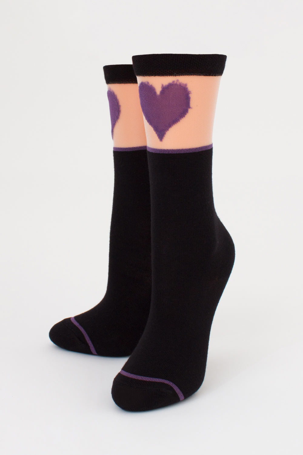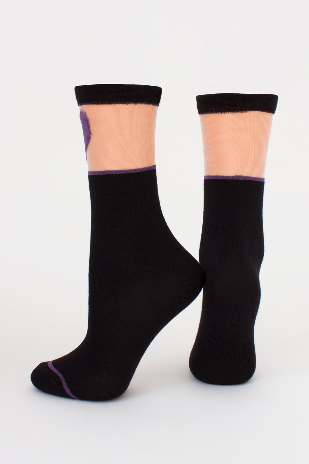 Сверху гольфы украшены прозрачной вставкой из мононити с ярким рисунком в виде сердца, создавая интересный визуальный эффект.