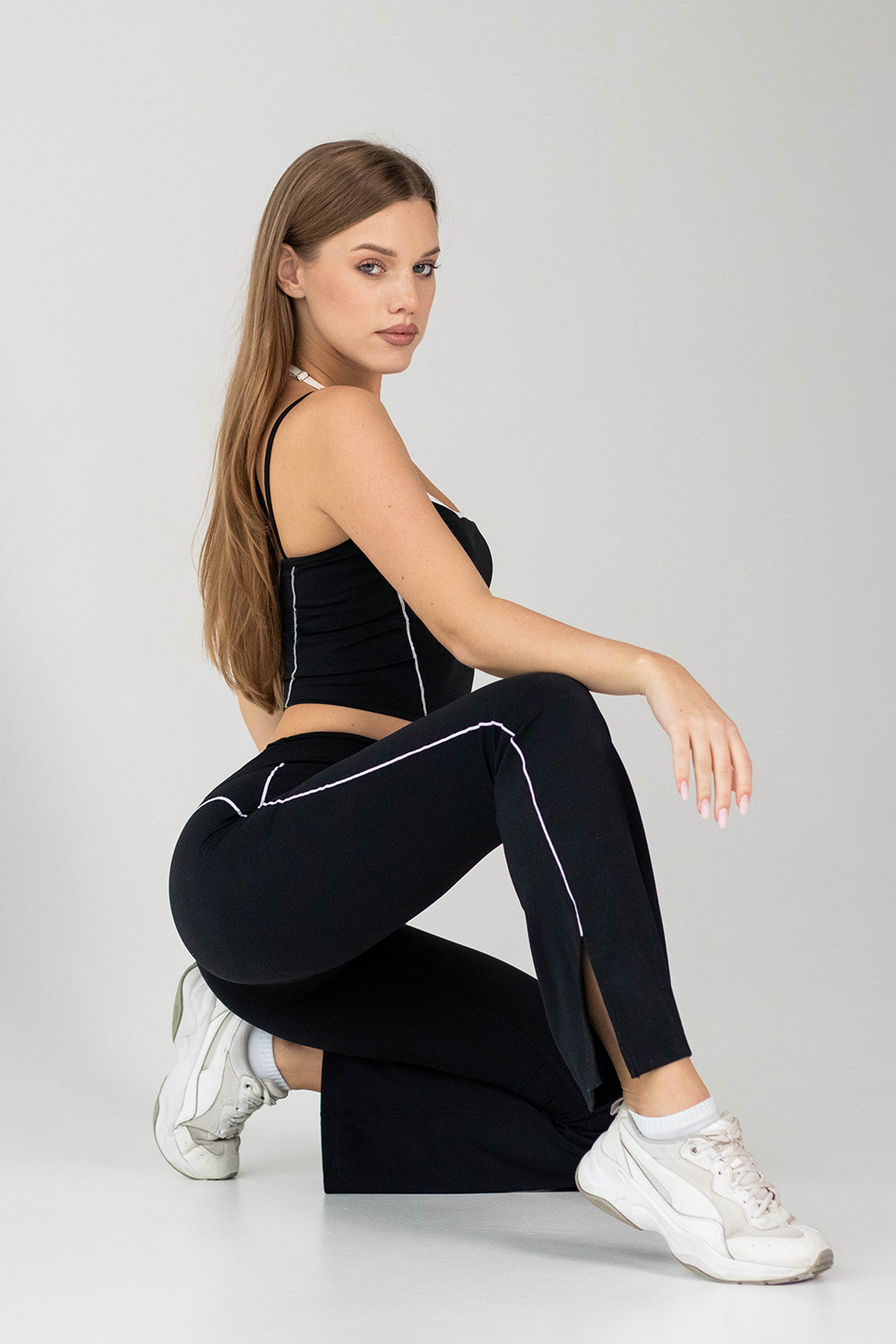 Крой клёш: расширение от колена создаёт трендовый силуэт и позволяет сочетать леггинсы как с кроссовками, так и с обувью на каблуке.