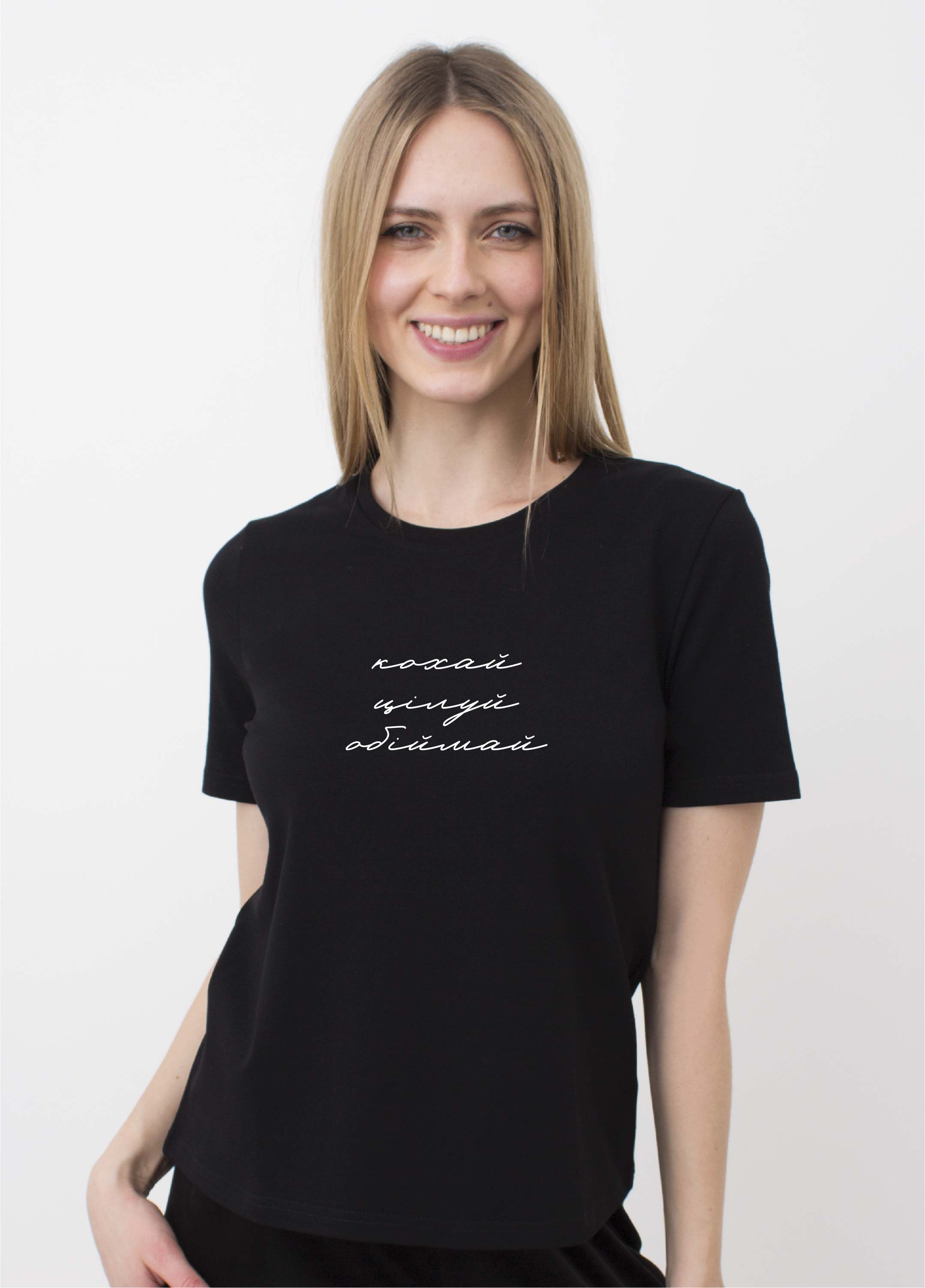 Футболка женская с надписью "Люби.Целуй.Обнимай" T-SHIRT WOMEN UNIQUE PRINT 4802/010 (black W00023),черный