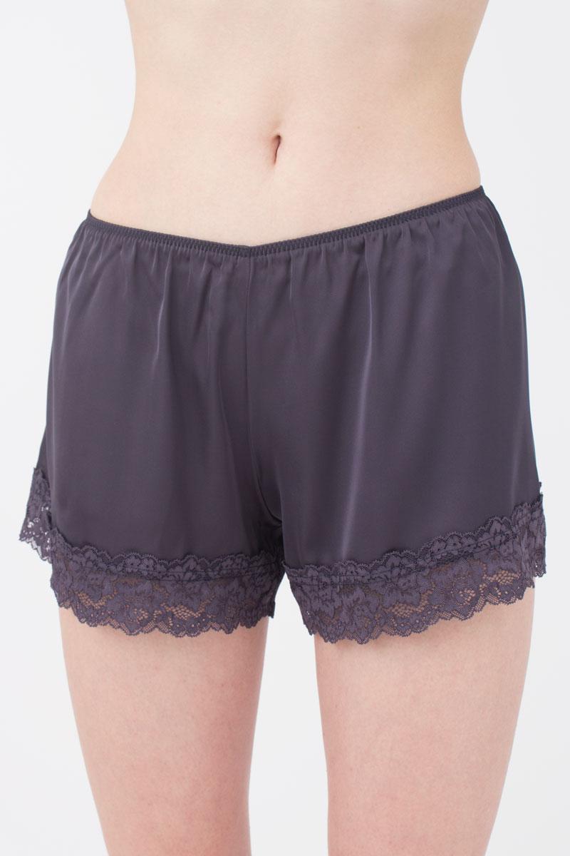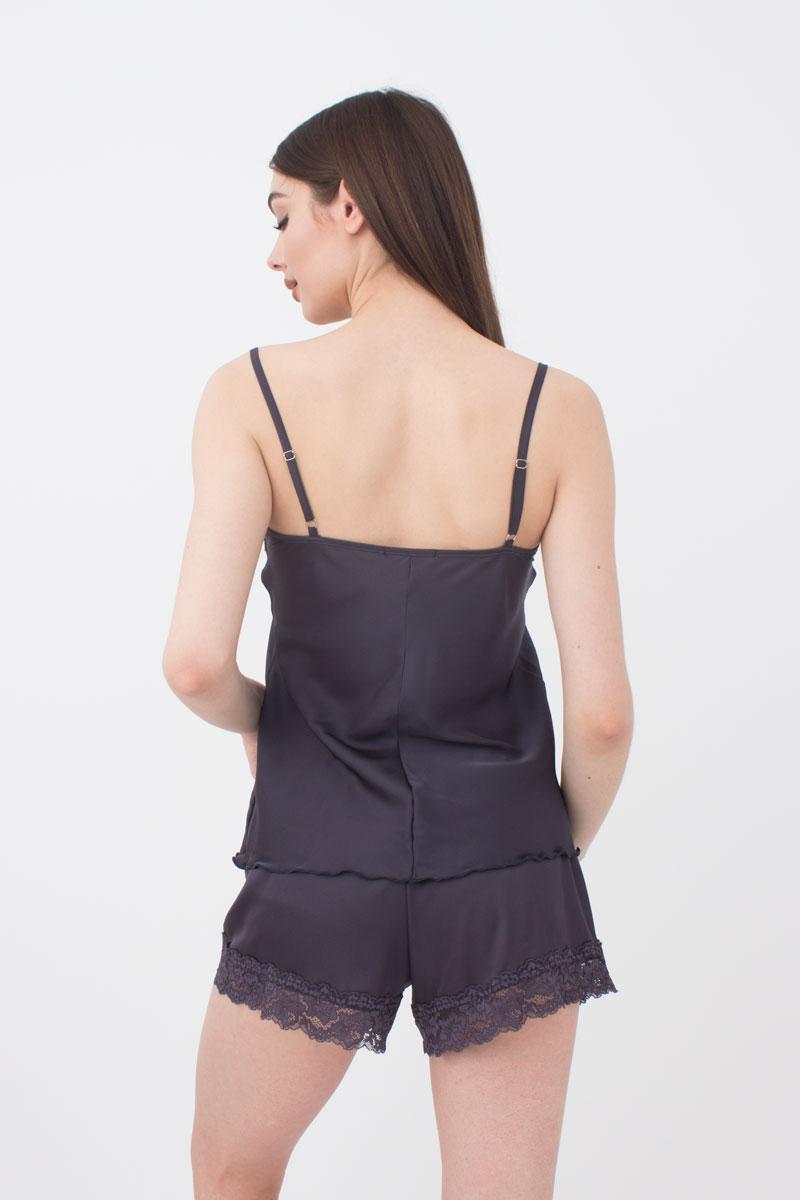 Вырез на топе и низ шорт декорированы ажурным кружевом.