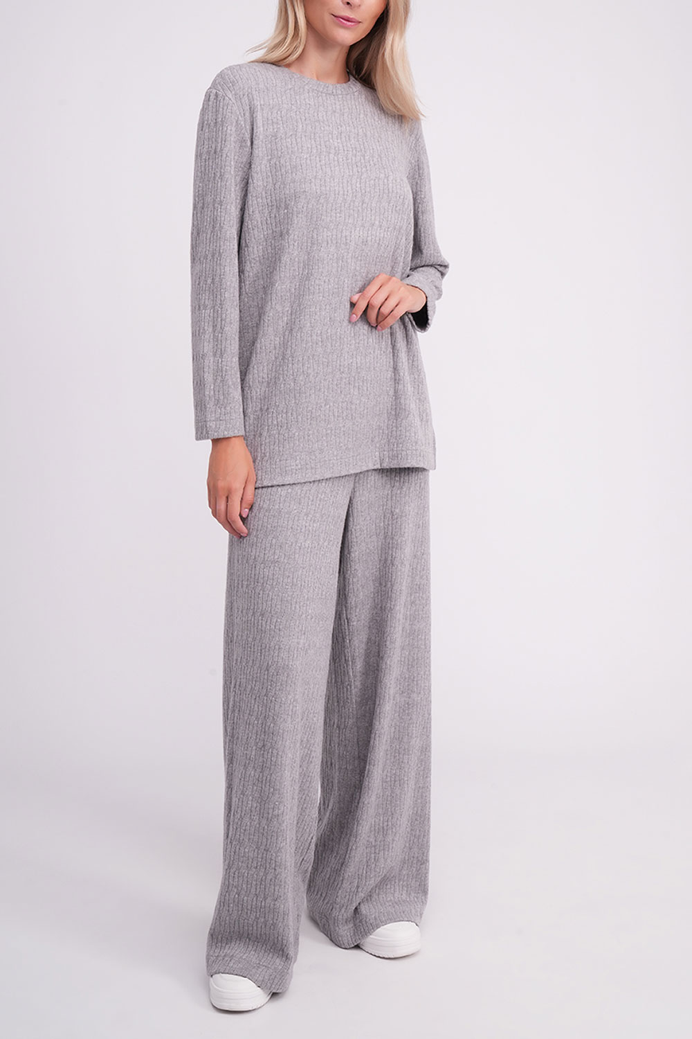 В комплект входит удлинённый лонгслив с аккуратным круглым вырезом и стильными боковыми разрезами, а также прямые брюки с широким эластичным поясом, обеспечивающим удобную посадку на талии.