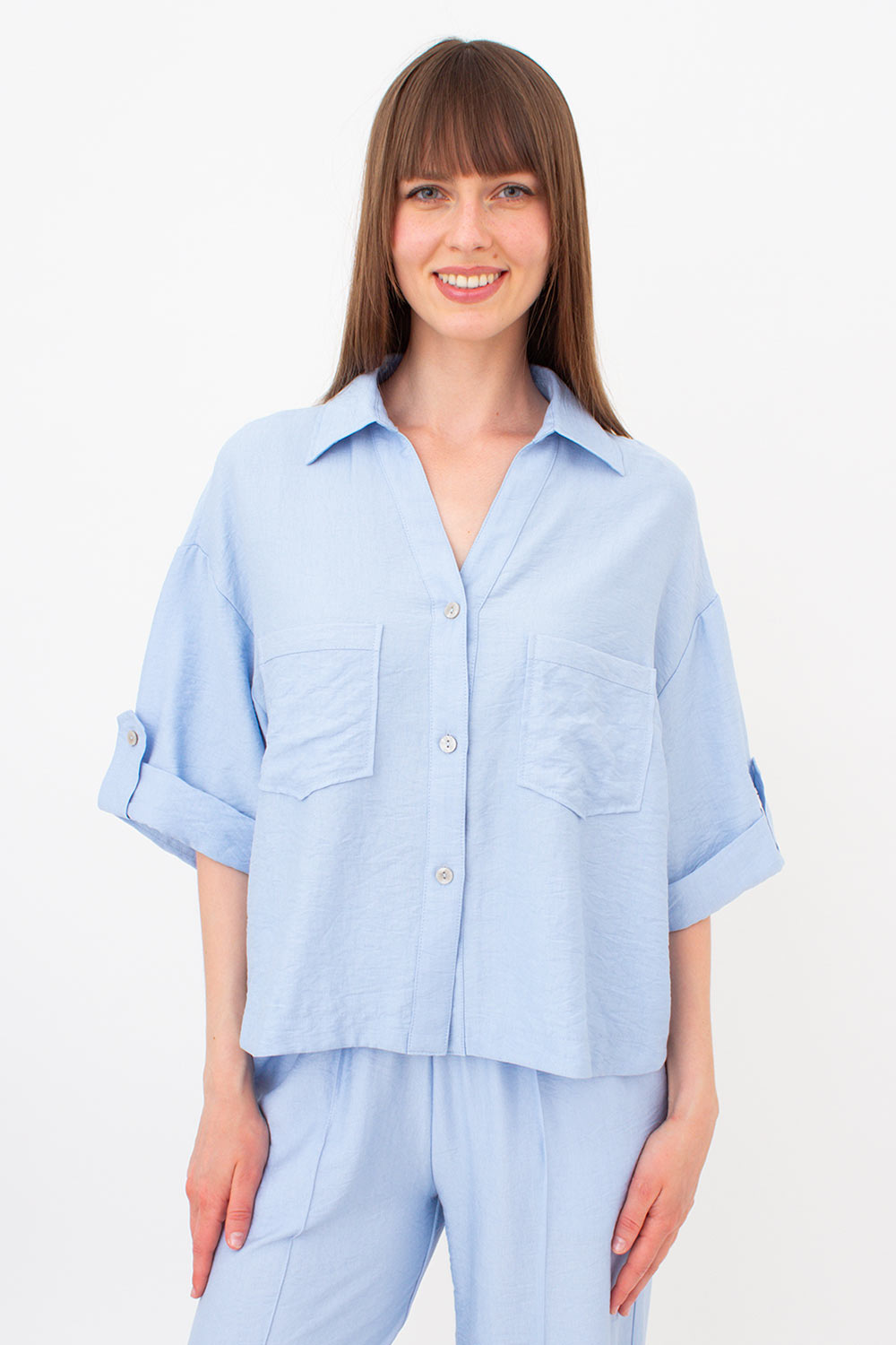 Рубашка прямого кроя с короткими рукавами, V-образным вырезом и отложным воротником, дополненная подворотами на рукавах и стильными накладными карманами.