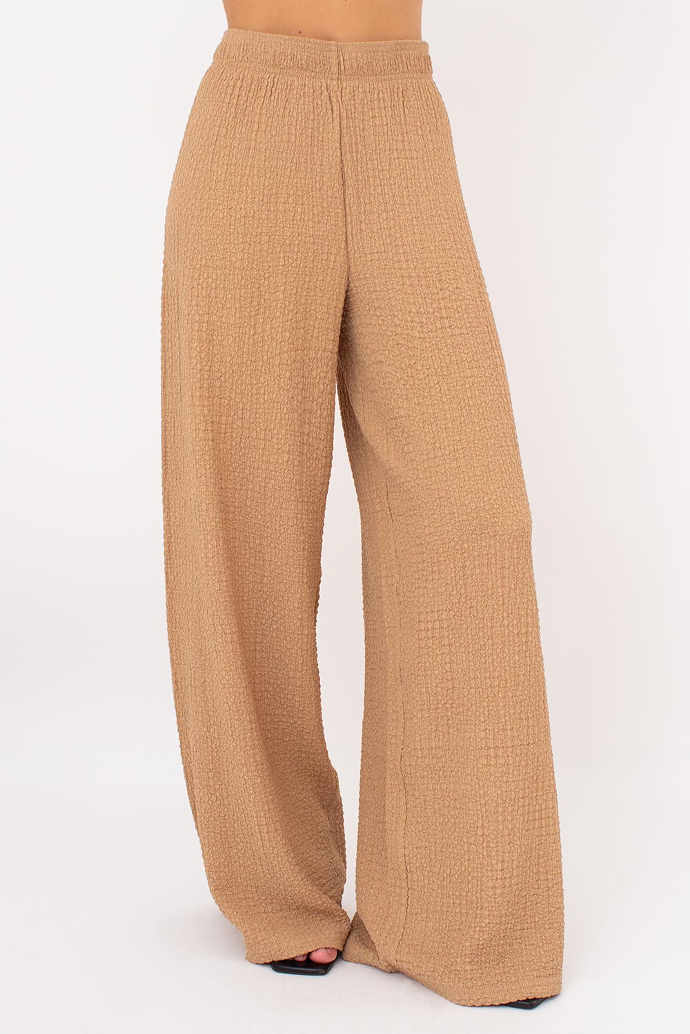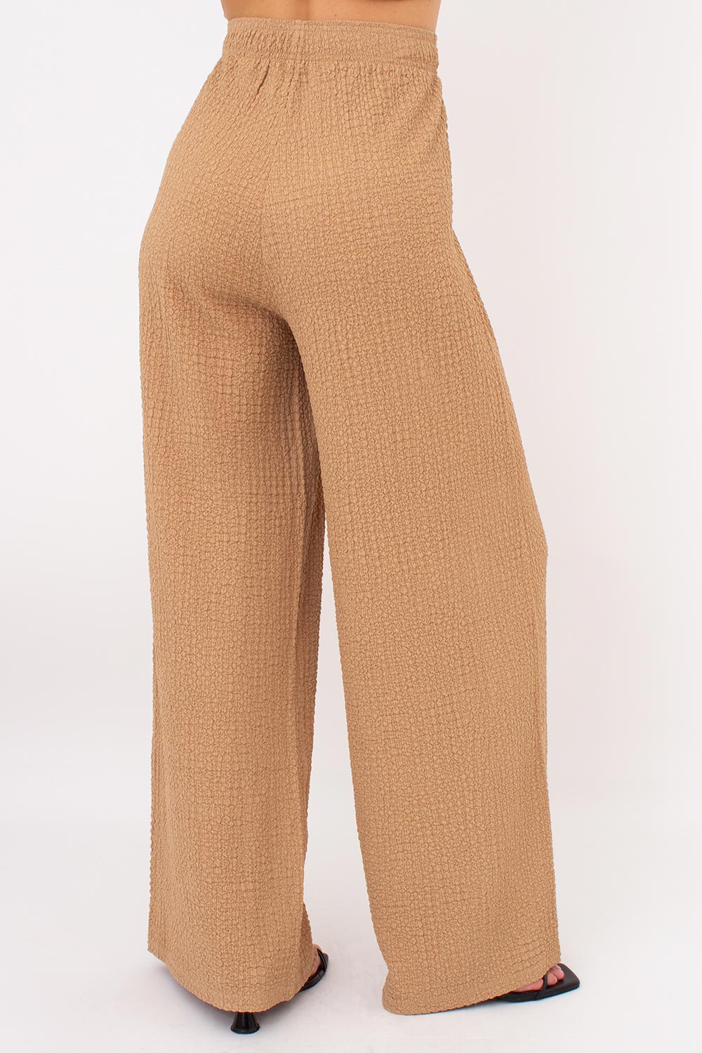 Модель состоит из футболки и штанов, выполненных из легкой жатой ткани, которая мягко ложится по фигуре и дарит чувство свободы.