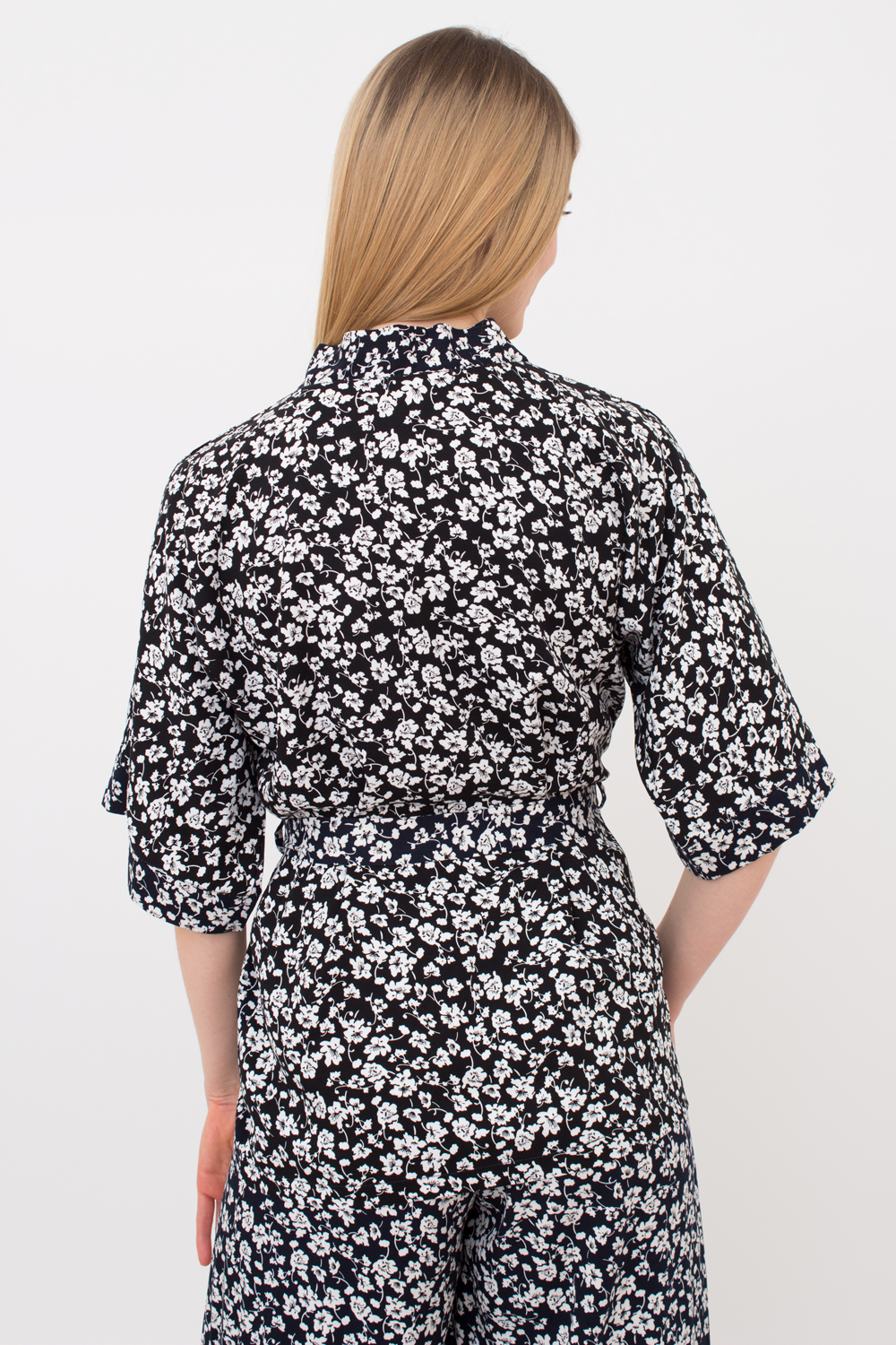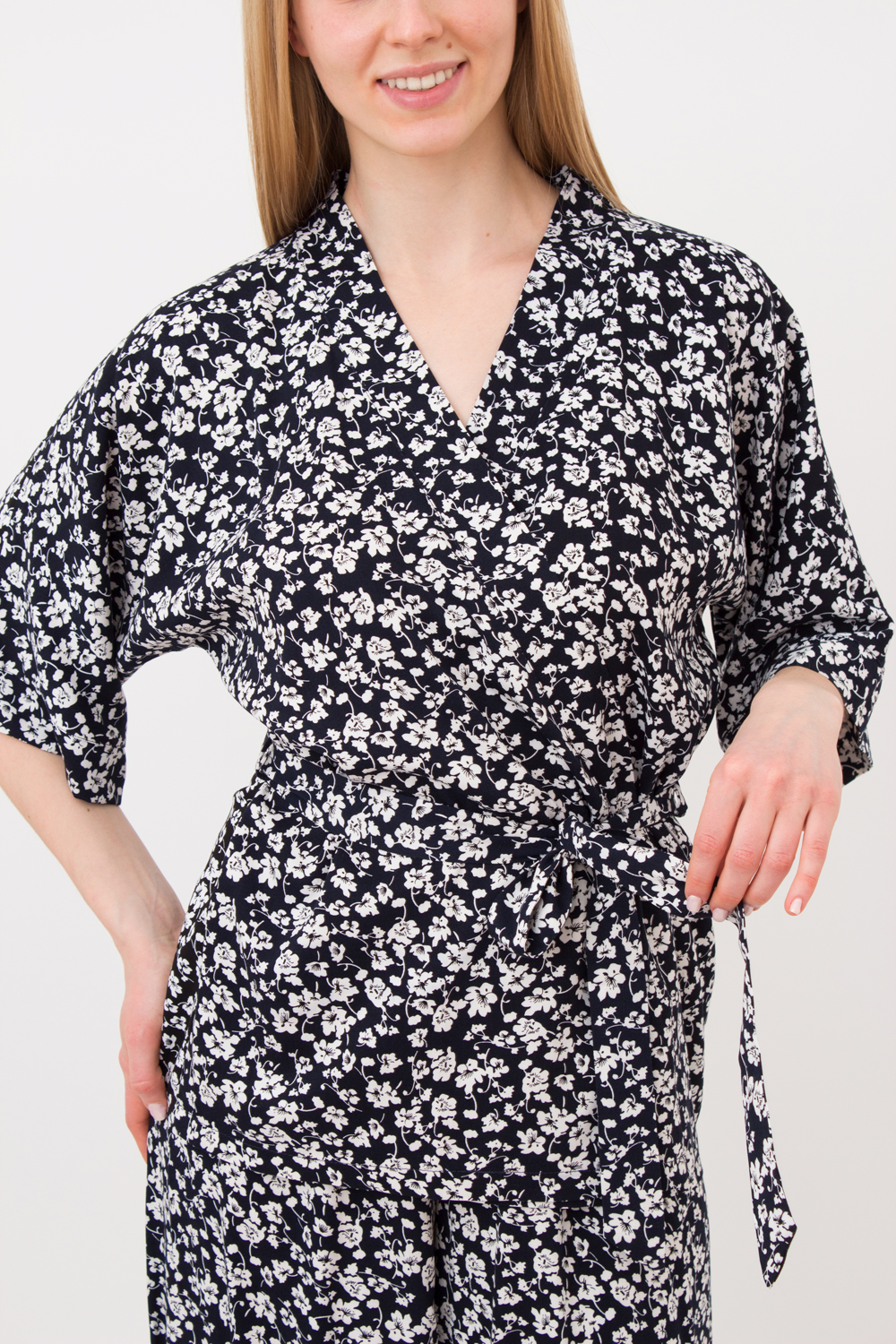 Жакет с короткими и широкими рукавами до локтя выглядит очень стильно и современно. Пояс подчеркивает талию и создает изящный силуэт, придавая образу женственности.