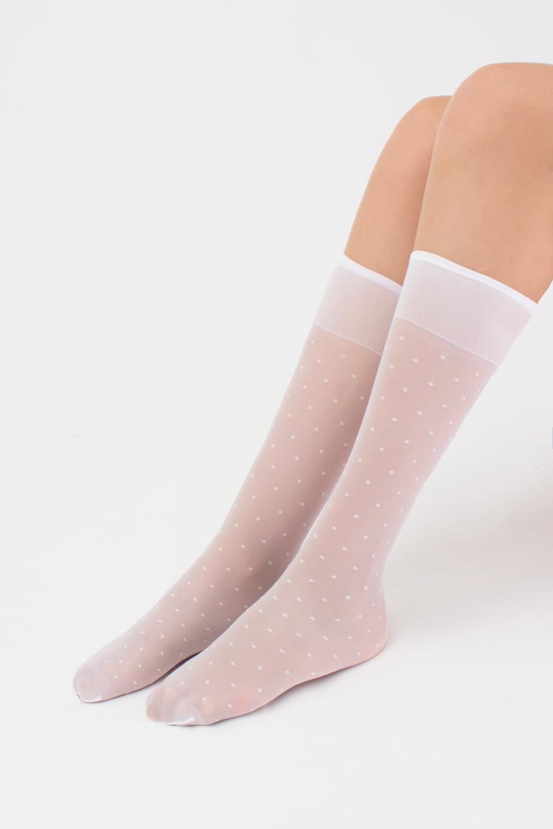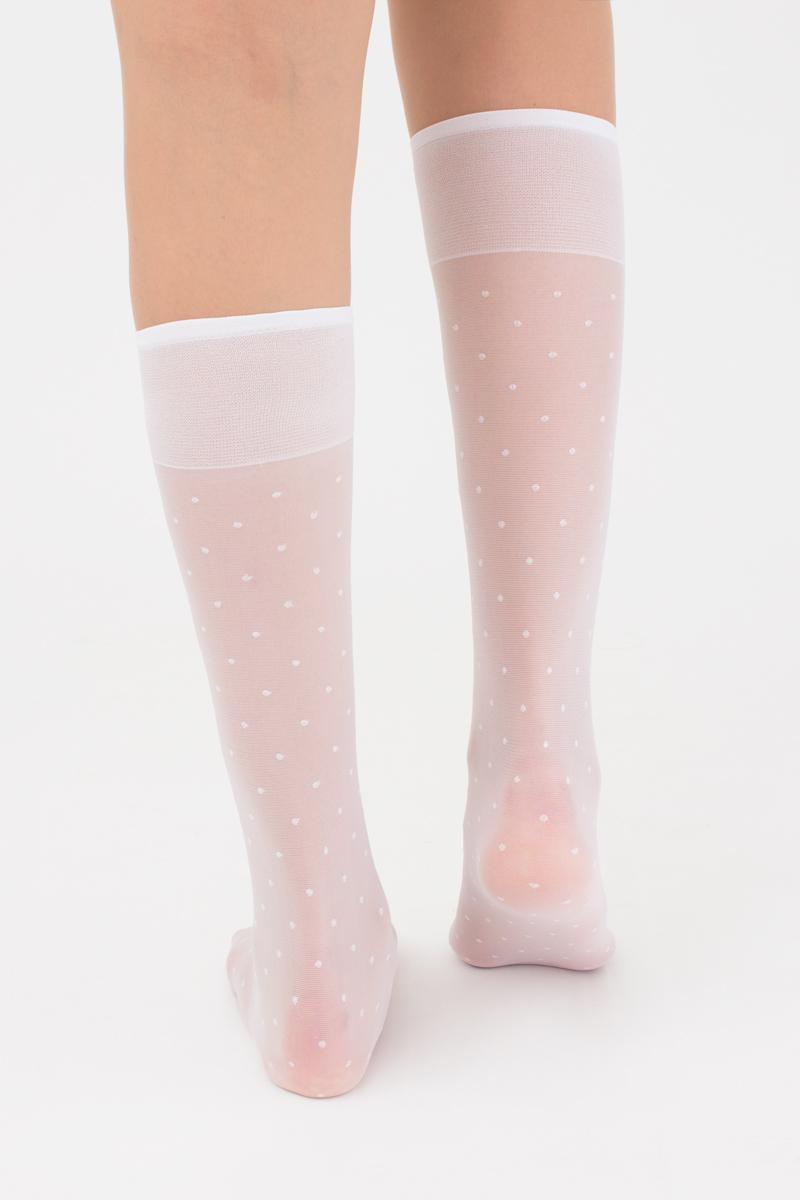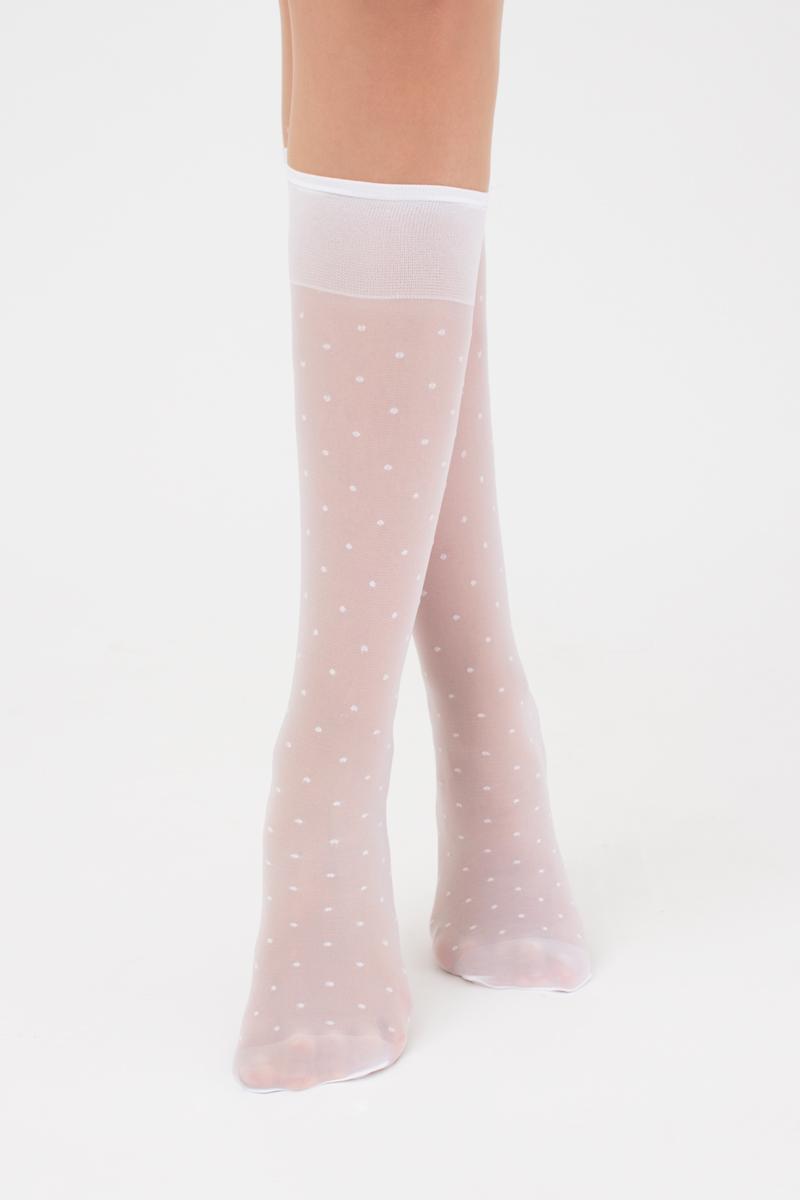 Прозрачные детские гольфы с оплетенным эластаном,с комфортной резинкой и усиленными мысками. По всей длине модели размещен тканый узор "горох".