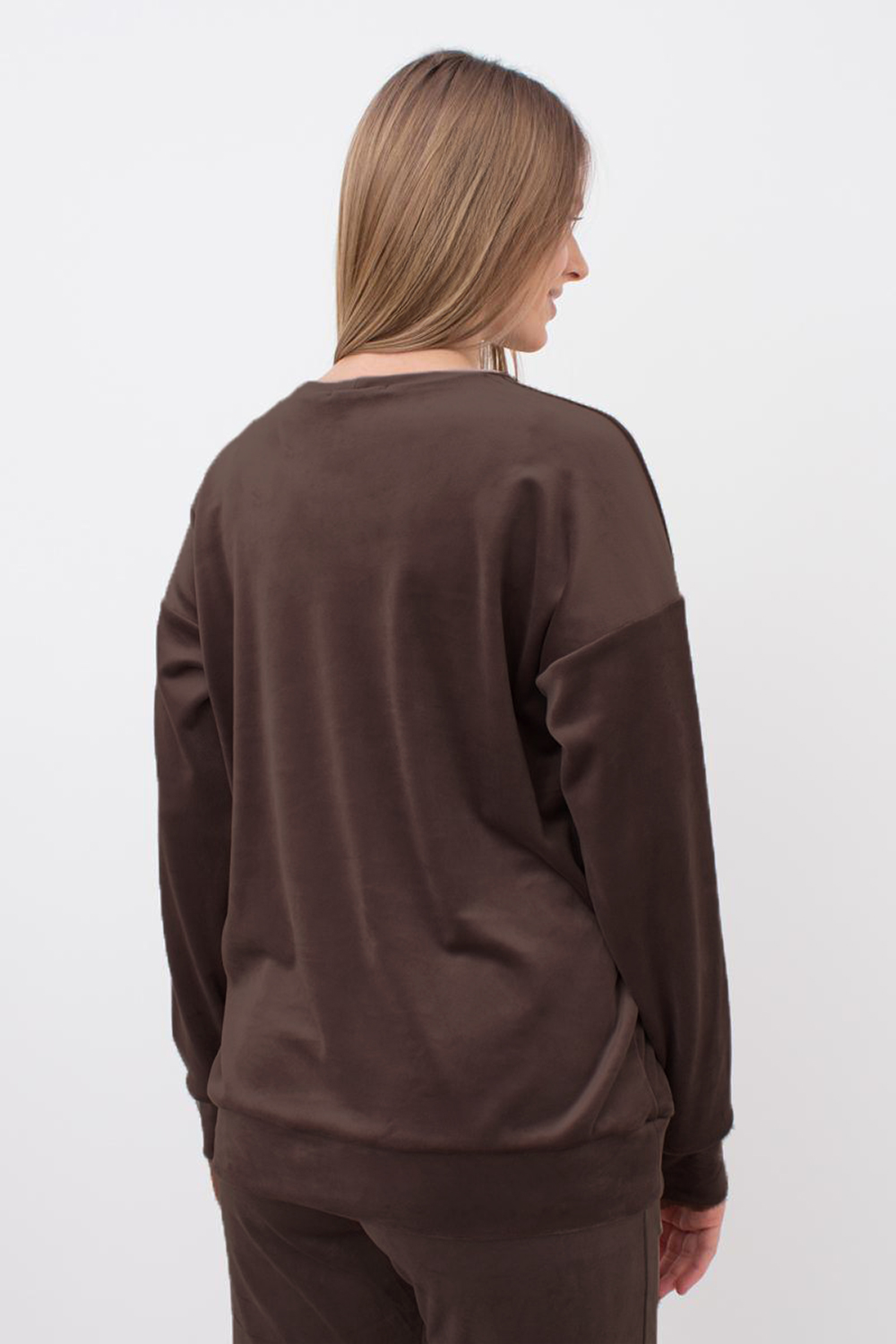 Мягкий свитшот свободного кроя изготовлен из велюровой ткани.