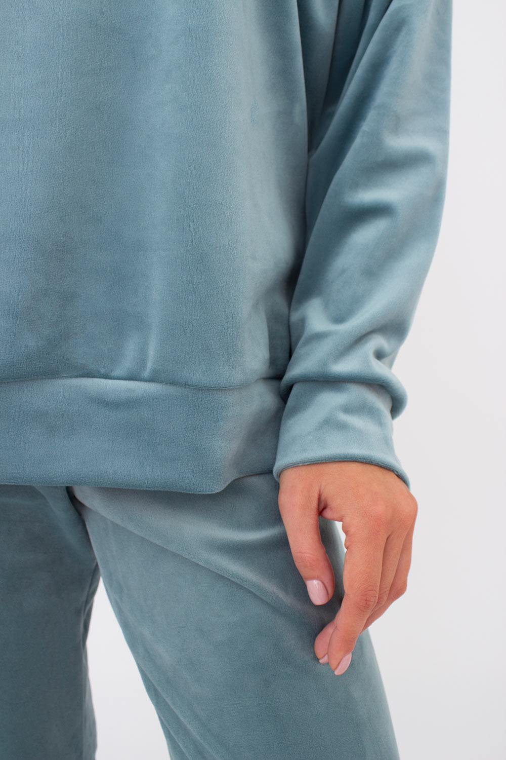 Мягкий свитшот свободного кроя изготовлен из велюровой ткани.