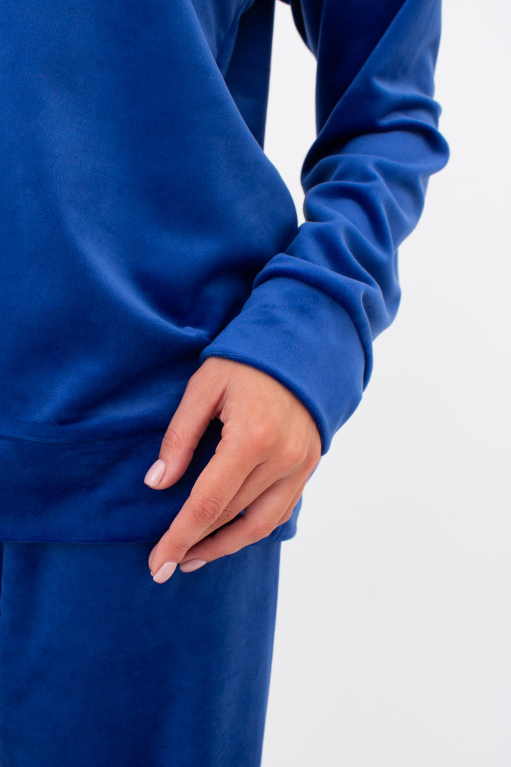 Мягкий свитшот свободного кроя изготовлен из велюровой ткани.