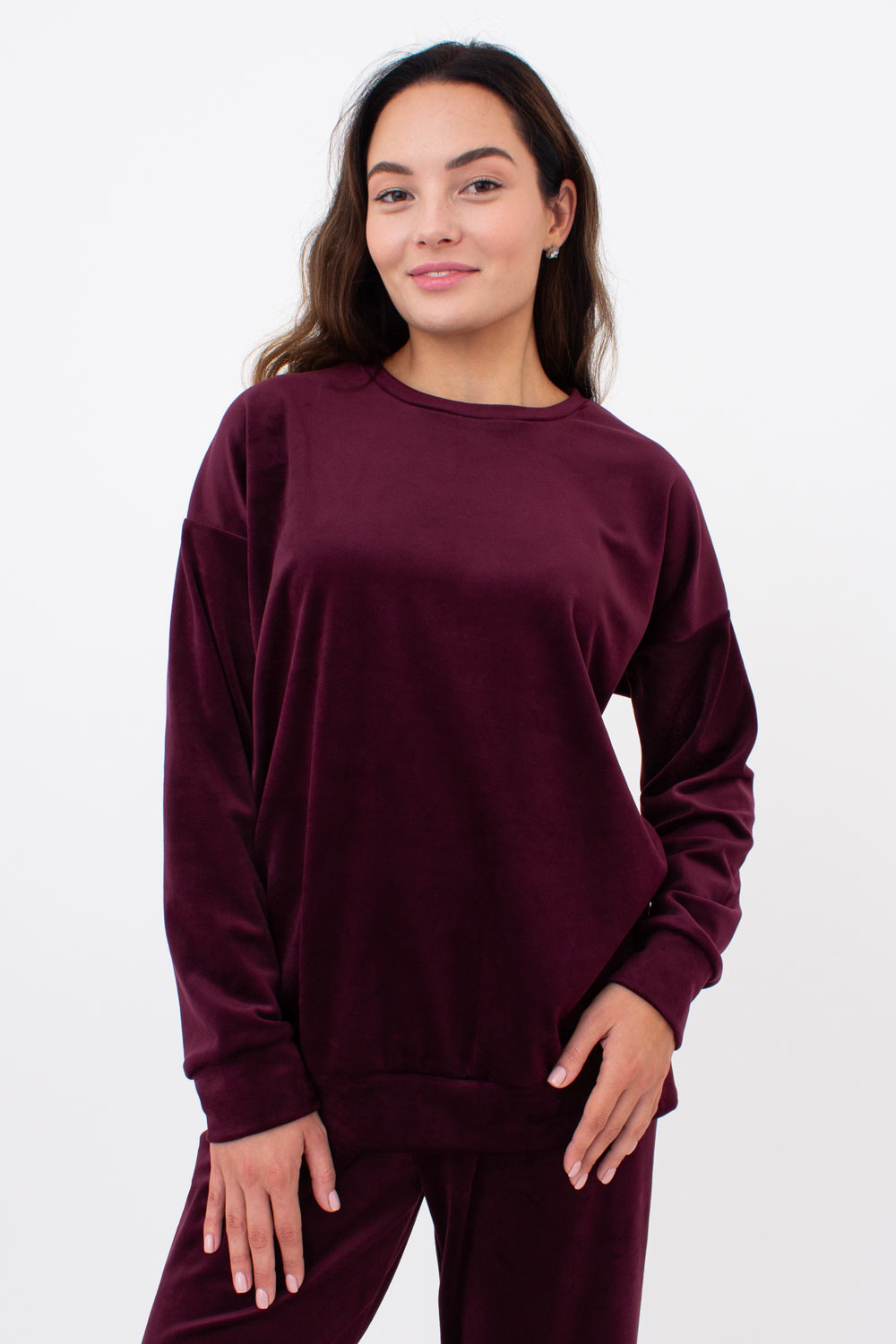Мягкий свитшот свободного кроя изготовлен из велюровой ткани.