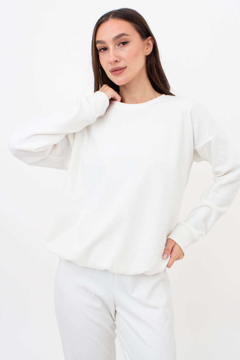Свитшот свободного кроя с манжетами, имеет круглый вырез горловины, придающий классический вид. Спущенная линия плеча придает легкость и непринужденность.