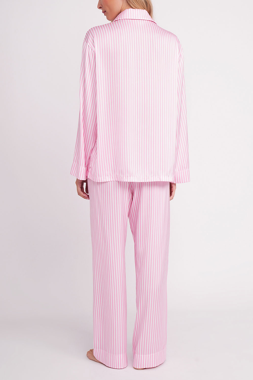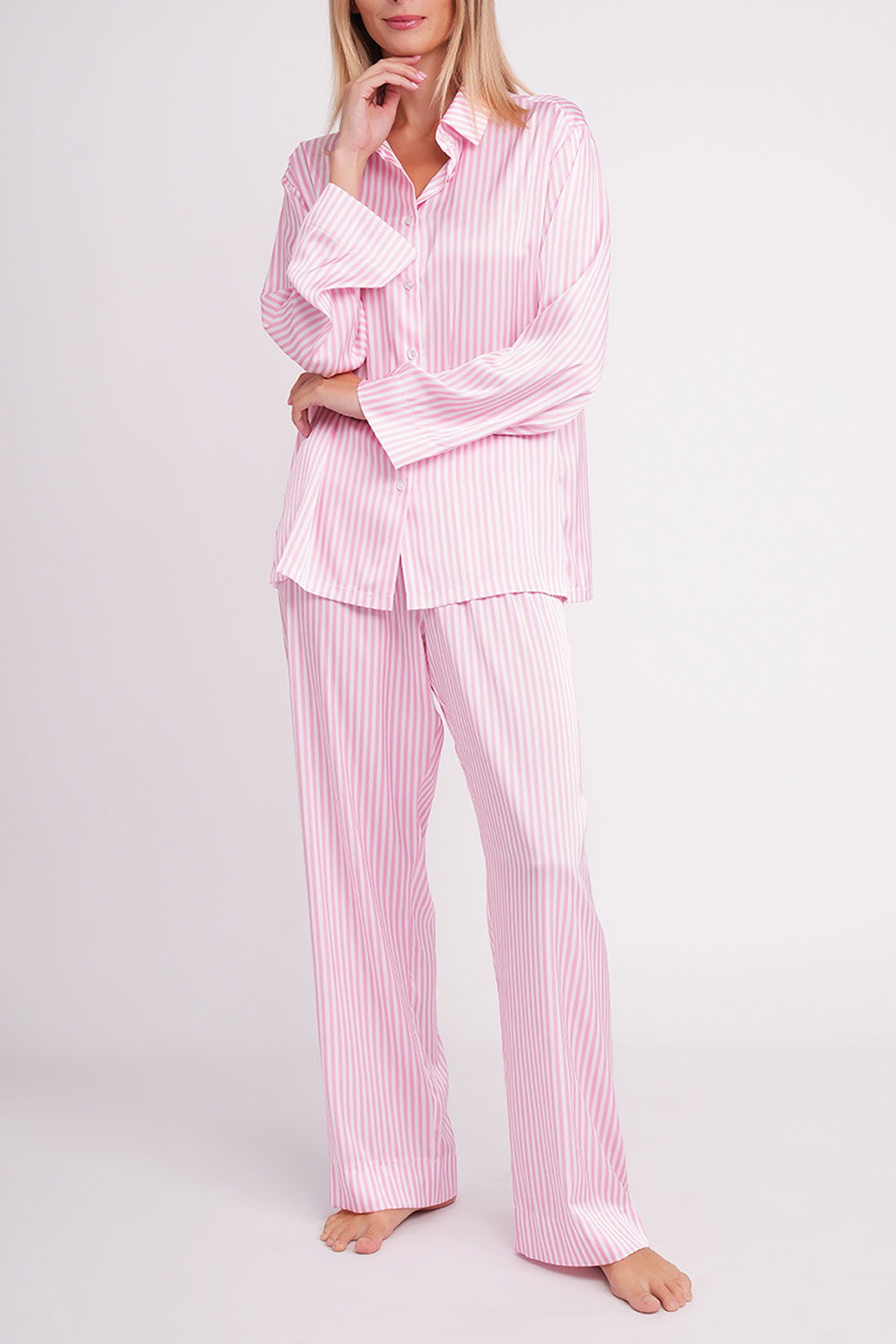 Піжама в смужку, що додає образу стриманої елегантності та візуально витягує силует.