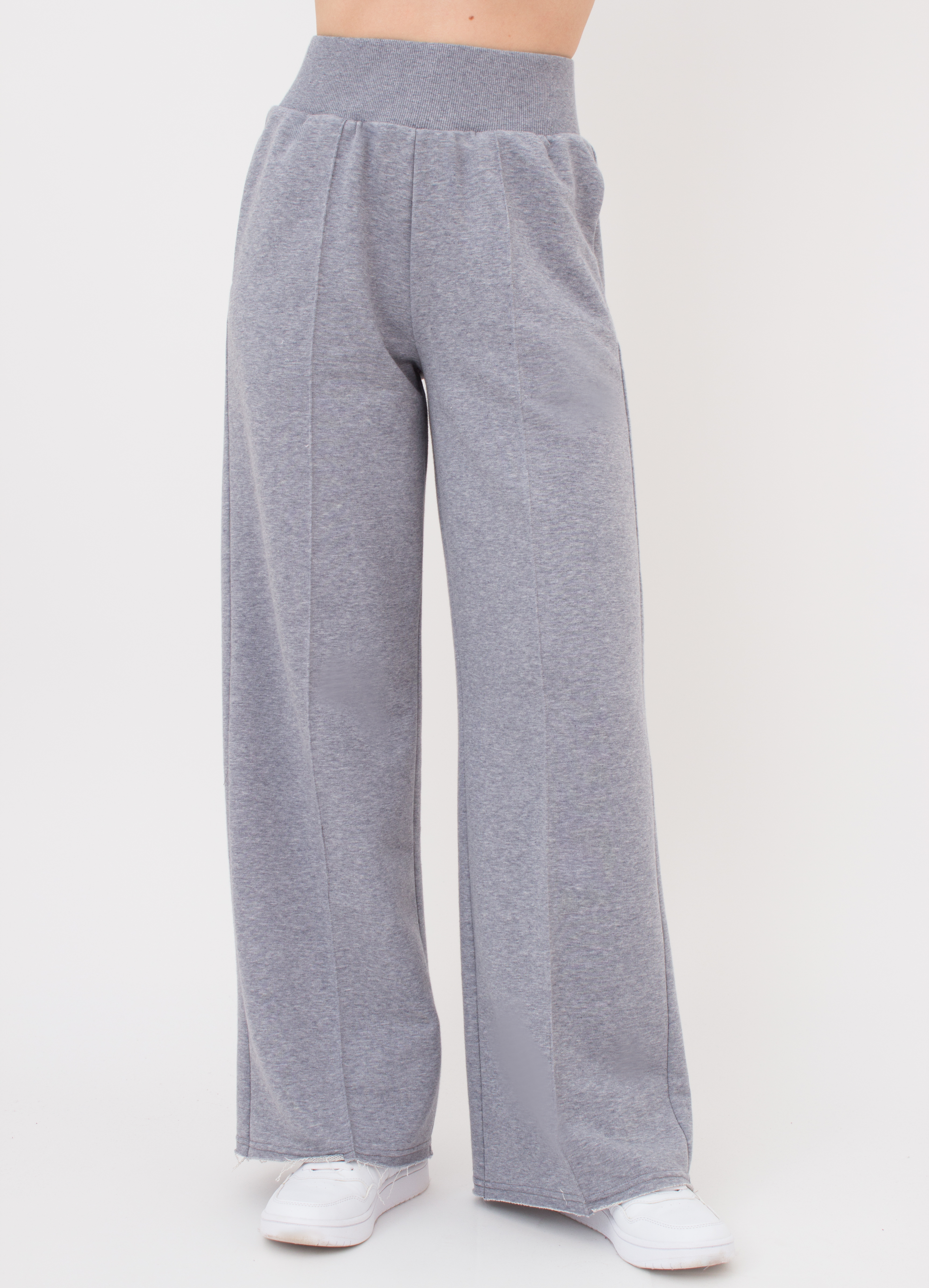 Штани вільного крою створені для бездоганного комфорту. Виготовлені з трьохнитки, відрізняються необробленими краями, що додають виробу стильного та неформального вигляду. Середня посадка ідеально підкреслює силует, а широкий пояс забезпечує комфортну посадку та надійно фіксує штани на тілі протягом дня.
