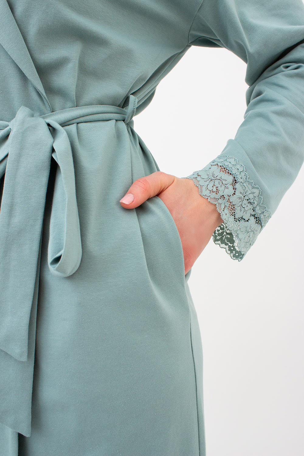 Кружевная окантовка добавляет акцент на рукава, делая каждое движение особенным. Халат имеет карманы.